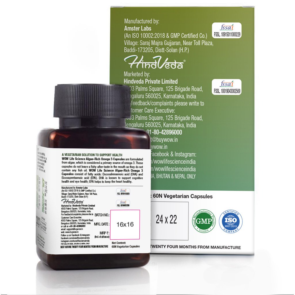 WOW Life Science Algae-Rich Omega 3 Capsules are formulated from algae, which is considered a primary source of omega 3. These capsules do not leave a fishy after-taste in the mouth as they do not contain any fish oil. WOW Life Science Algae-Rich Omega 3 Capsules consist of fatty acids: Docosahexaenoic acid (DHA) and Eicosapentaenoic acid (EPA). DHA is known to support cognitive health and eye health; EPA helps to keep the heart healthy and maintains healthy cholesterol by maintaining “good” HDL cholesterol levels. Omega 3 aids to improve calcium content in the bones and supports muscle recovery. It also boosts skin structure and gives it a firm, supple texture.