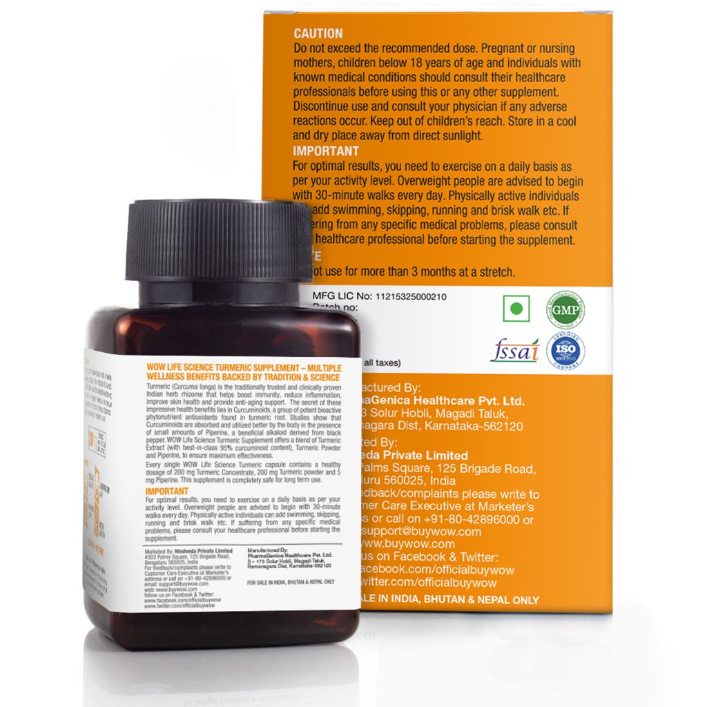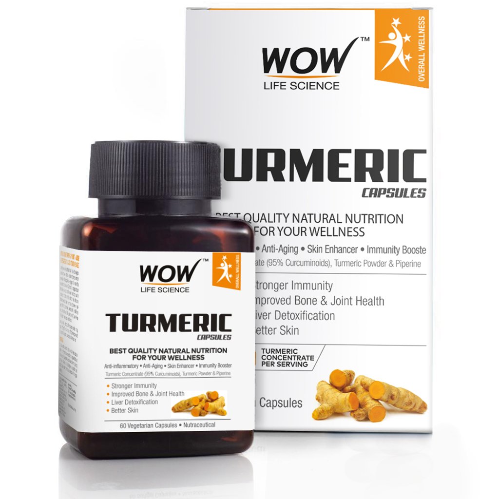 WOW Life Science Turmeric Capsules provide a healthy blend of Turmeric Concentrate with high Curcuminoid content, pure Turmeric (Curcuma longa) Powder and Piperine (derived from black pepper). Helps boost immunity, reduce inflammation, improve skin health and provide anti-aging support. Regular consumption may improve bone and joint health, boost immunity, enhance skin and detoxify liver.