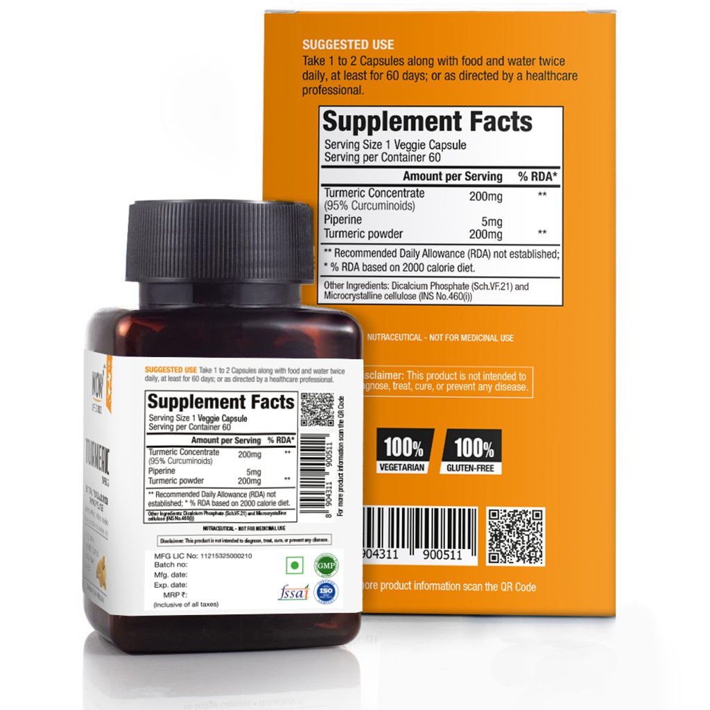 Every capsule 200 mg Turmeric Concentrate, 200 mg Turmeric powder & 5 mg Piperine.