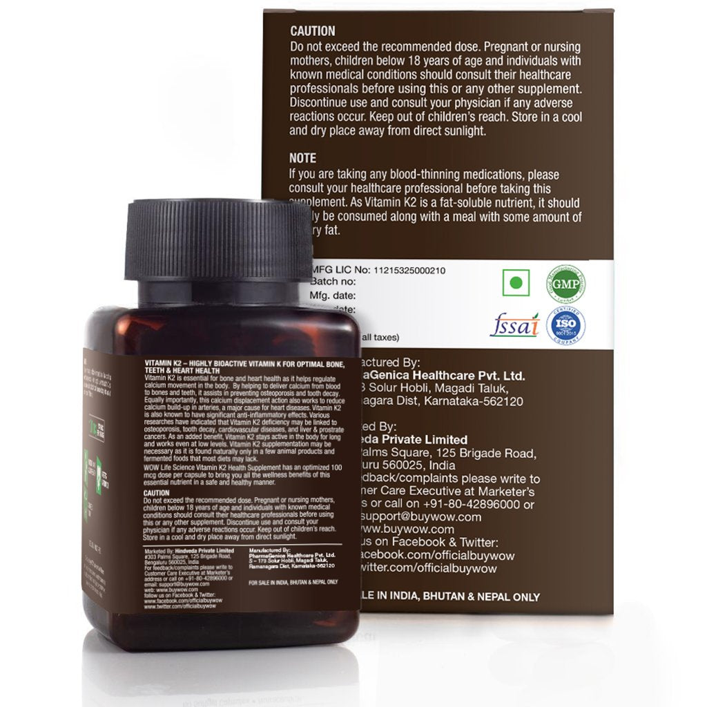 WOW Life Science Vitamin K2 Supplement contains 60 capsules per pack.