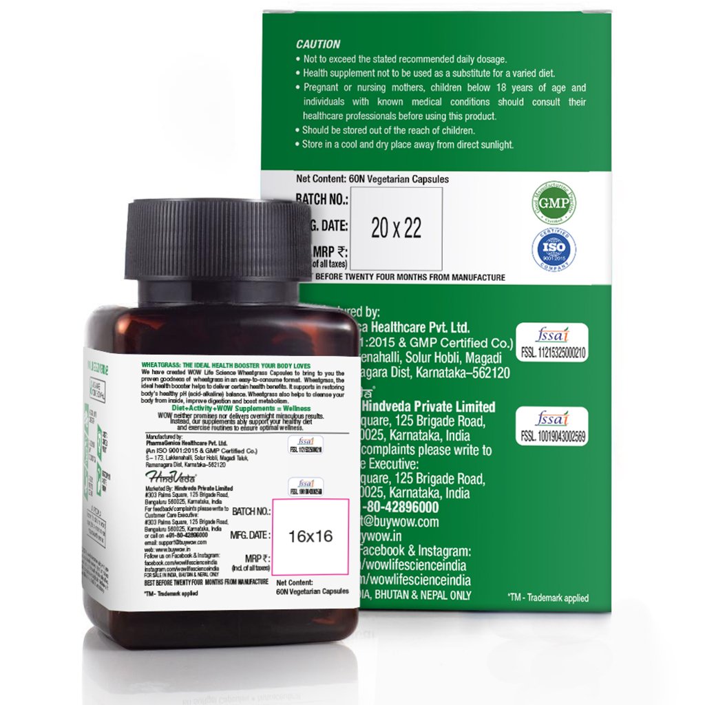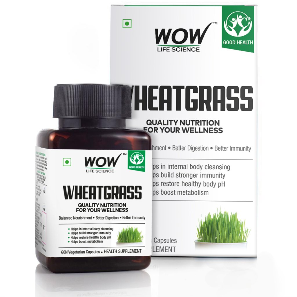 WOW Life Science Wheatgrass Supplement brings you goodness of pure wheatgrass in easy-to-consume capsules form. Wheatgrass is known as a superfood exceptionally rich in vitamins A, C and B complex, calcium, iron, magnesium, phosphorus, potassium, sulphur, cobalt, zinc and 19 essential amino acids. It can be used to improve digestion, detox the body, and boost metabolism. Wheatgrass balances the acid and alkaline levels in the body. WOW Life Science Wheatgrass Supplement contains pure wheatgrass powder blended with chlorophyll powder for maximum health benefit.