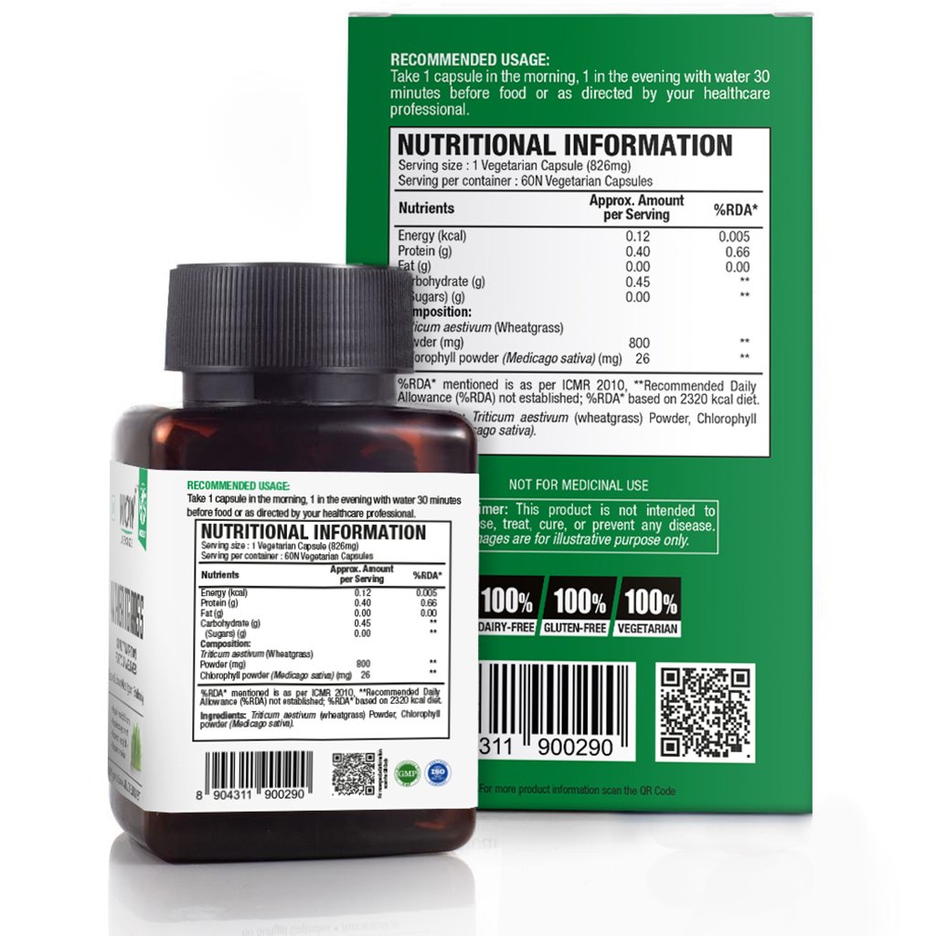 - 60 capsules per pack,800mg of pure wheatgrass powder& 26 gm of chlorophyll powder in each capsule.