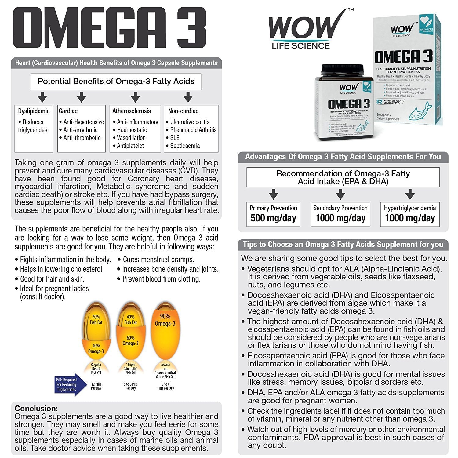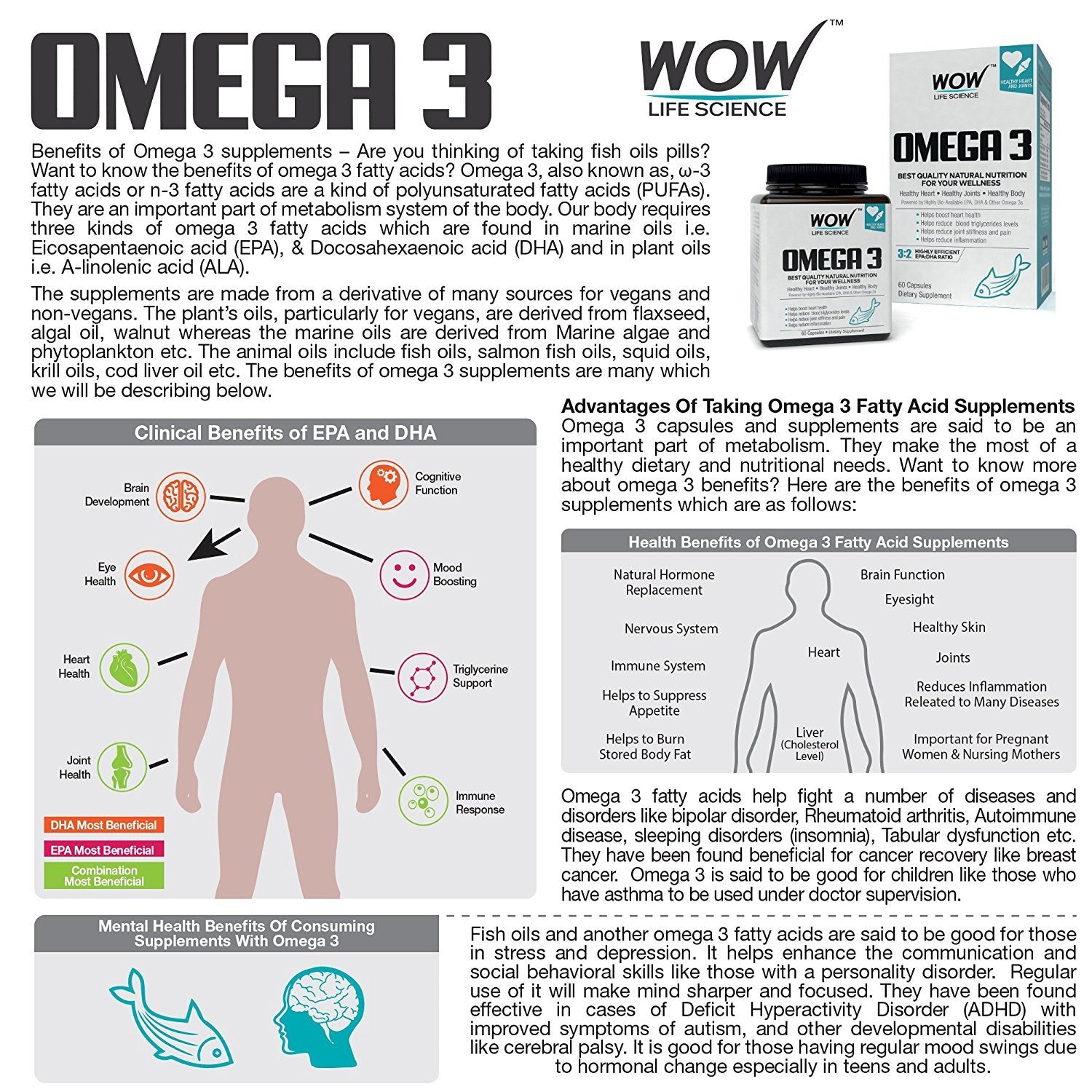 WOW Life Science Omega 3 for healthy heart and body. Omega 3 in fish oil has Eicosapentaenoic acid (EPA) and Docosahexaenoic acid (DHA). WOW Life Science OMEGA 3 has the optimal 3:2 EPA:DHA ratio. It gives you 1000mg of pure blend of Omega 3 – 550mg EPA, 350 mg DHA and 100 mg other Omega 3. It offers anti-inflammatory benefits, improves bone and joint health. It helps in lowering blood pressure.