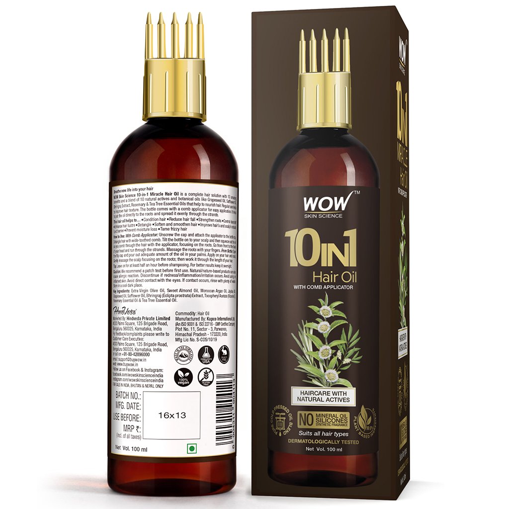 WOW Skin Science 10-in-1 Miracle Hair Oil is a premium hair oil powered with 10 renowned natural bioactive ingredients: Cold Pressed Extra Virgin Olive, Almond, Argan, Jojoba, Grapeseed & Safflower Oils, Bhringraj Extract, Vitamin E and Rosemary and Tea Tree Essential Oils, that work together to revive and bring gloss and vitality to your tresses. It comes with a Comb Applicator for easy use. Total hair treatment that breathes new life into dull, thinning, dandruff-prone and lifeless hair. WOW Skin Science 10-in-1 Active Miracle Hair Oil's premium bioactives work together to revive your crowning glory. Strengthens hair roots, reduces split ends, detangles tresses, improves hair's lipid barrier, adds extra silkiness, gives rich conditioning, eliminates dandruff, reduces hair fall, enhances lustre and aids moisture retention. ontains only botanical oils and extracts, totally free of mineral oil, paraffin oil, petrolatum or liquid paraffin. Maximum Shelf Life: 24 Months.