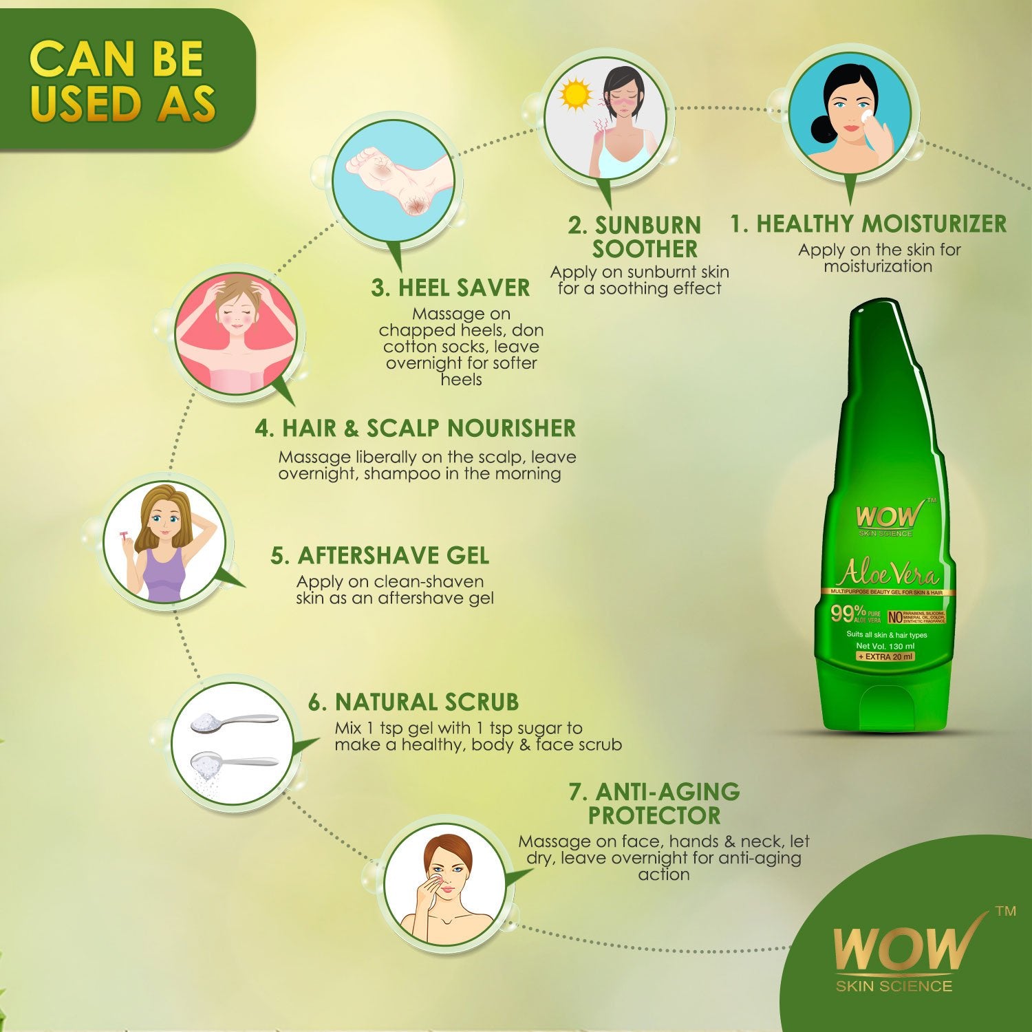 WOW Skin Science Aloe Vera Gel is 99% pure Aloe Vera, hygienically extracted & carefully packaged, to retain its natural healing & rejuvenating benefits. It is a multipurpose beauty care product designed for healthy skin, hair & scalp care.