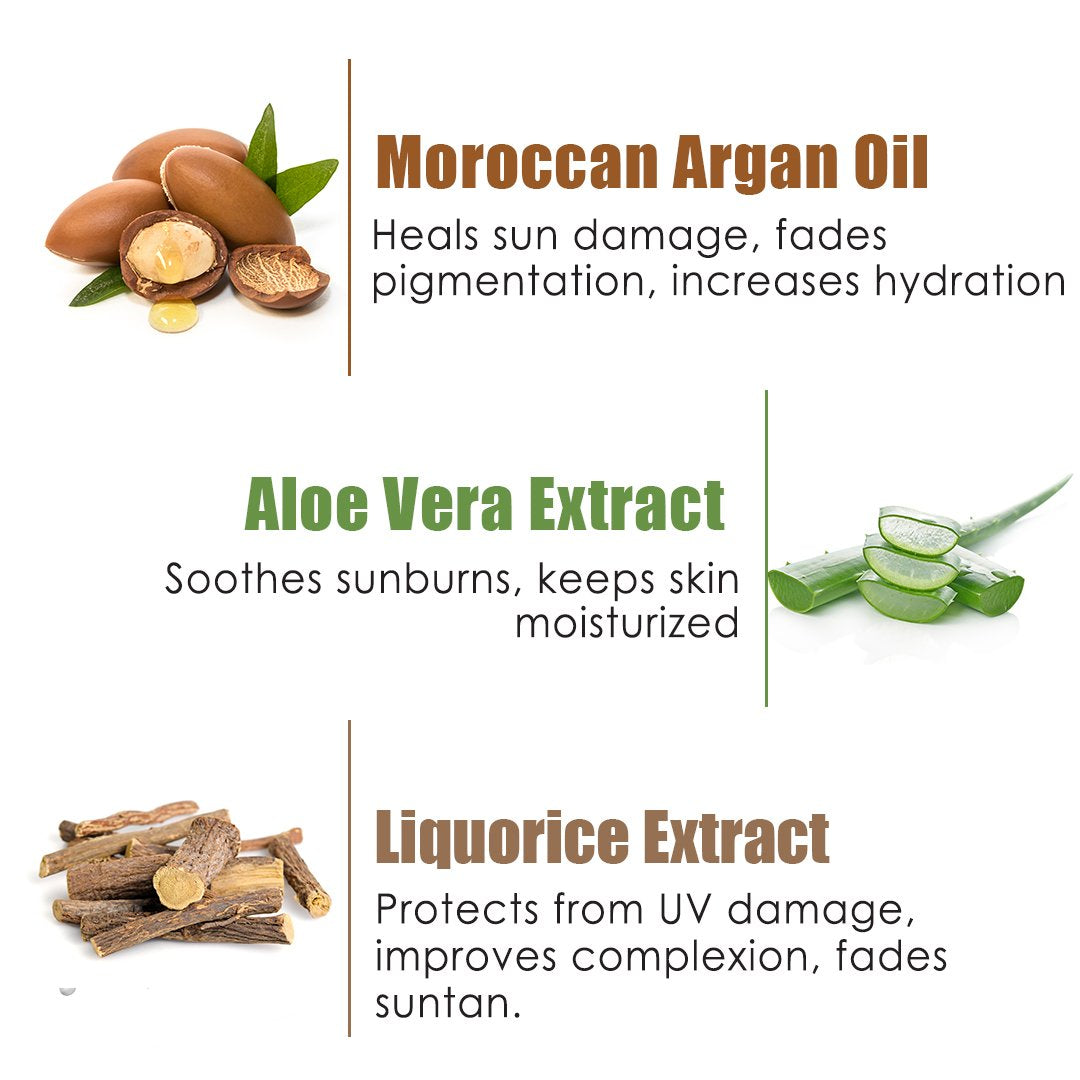 Contains pure Moroccan Argan Oil, Aloe Vera Extract, Liquorice Extract, Vitamin E, Titanium Dioxide and Zinc Oxide.