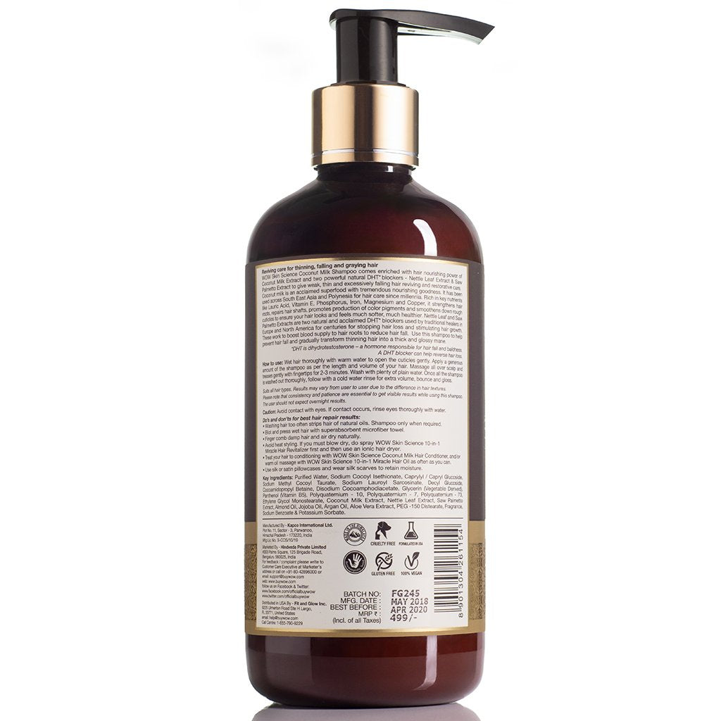 Enhance your hair’s natural lustre with WOW Skin Science Coconut Milk Shampoo. It is enriched with coconut milk which is well known hair nourisher. Regular use adds softness to dry, brittle hair. Coconut milk has essential nutrients that help nourish the scalp and the roots. Nettle leaf and Saw Palmetto extracts stimulate hair growth. The two actives are natural DHT (Dihydrotestosterone) – hormone responsible for hair loss - blockers. They protect the roots by preventing DHT from binding to the follicular cells. This ensures healthy hair growth. Use on regular basis to ensure healthy, glossy hair.