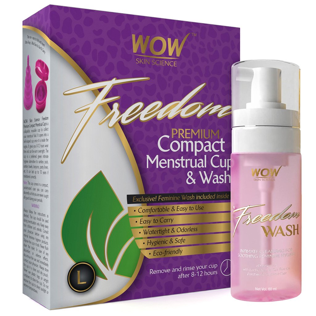 WOW Skin Science Freedom Premium Menstrual Cup & Wash have been created to meet your period needs with hygiene, comfort and sustainability. WOW Skin Science Freedom Premium Menstrual Cup is a soft, flexible and bell-shaped cup made of 100% medical grade, hypoallergenic silicone. Insertable like a tampon, it collects (doesn't abosrb) blood that can be emptied after every few hours and re-inserted for further use, or washed and stored till needed again. WOW Skin Science Cleansing Foaming Freedom Wash is formulated with lactic acid to help keep the vaginal pH at a healthy 3.5, and tea tree essential oil for keeping away odour causing bacteria.
