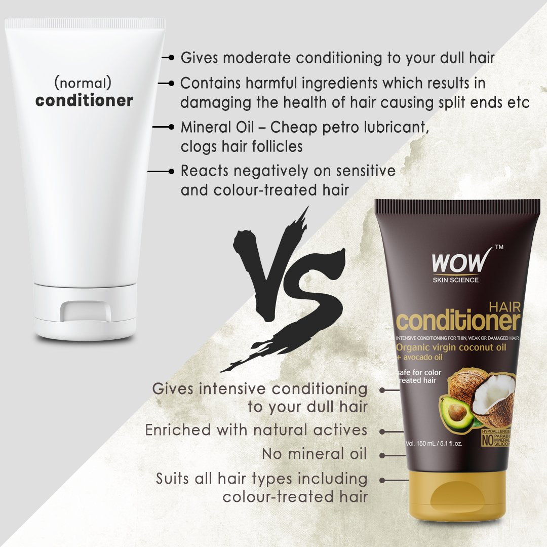 WOW Skin Science Hair Conditioner is the best-in-class hair conditioner enriched with cold pressed Virgin Coconut & Avocado Oils & Vitamins B5 & E, formulated to efficiently repair & revive weak, thin & damaged hair.