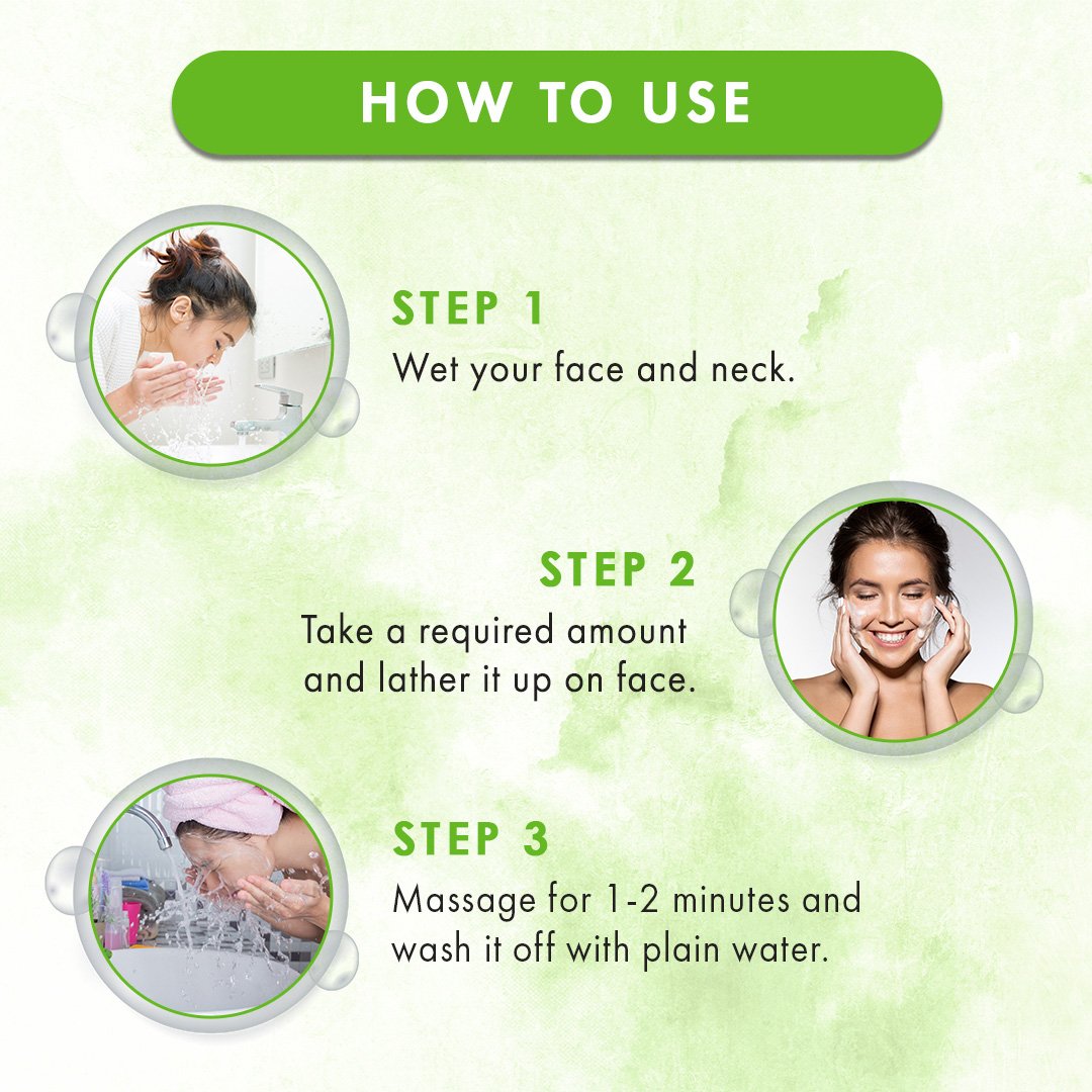 Wet your face well. Take a coin sized amount of the face wash and emulsify between your palms. Apply on your face and neck and create a lather.