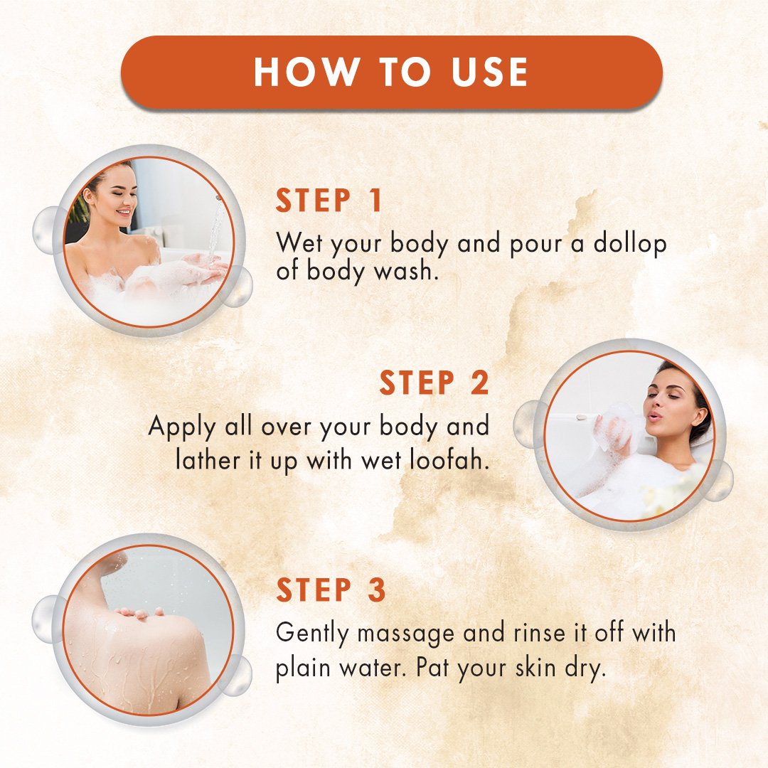 Wet body. Pour a dollop of shower gel on wet loofah, washcloth or sponge. Apply all over your body.